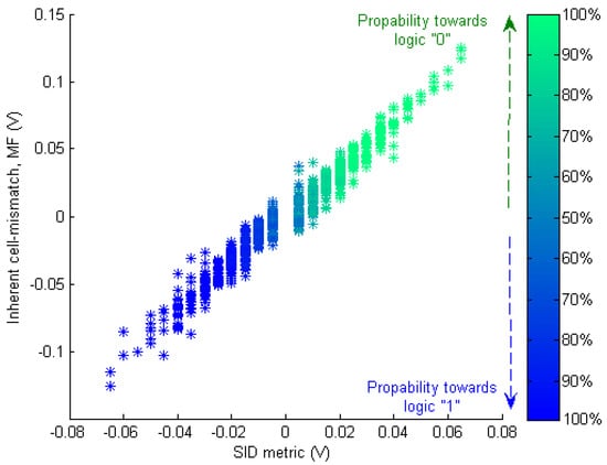 On the other hand, memory cells that have about 50% SUV probability are represented by colors located at the center of the legend in Figure 10. The start-up behavior of these cells is greatly affected by internal noise and may therefore be considered as memory cells with random SUV. The repeatability of the SUVs is associated with the immunity of SRAM cells against internal noise and reflects the strength of the inherent mismatch of the memory cell; thus, a highly mismatched cell is able to repeat its SUV on every power-up. To corroborate this, this study analyzed the relationship between the probability of repeating SUV (probability of starting at logic ‘0’ or ‘1’) and the proposed metric. The results show that well-matched cells with low absolute MF values had very low repeatability, and their probability of starting at ‘0’ or ‘1’ was around 50% (random SUV), while strongly mismatched cells could have a higher repeatability, even when considering the existence of thermal noise. This result can be seen in Figure 11, where the correlation between the SUV probability and the proposed metrics is calculated for each memory cell. Each cell is represented by one star, where the color is based on the SUV probability—the greener the memory cell, the higher the probability of starting towards logic ‘0’ (higher P(‘0’)), and the bluer the memory cell, the higher P(‘1’) it will have; P(‘1’) = 1 − P(‘0’). Therefore, both sets of probabilities are complementary. However, the SUV probability is closely related to the value of the proposed metrics. We notice in Figure 11 that memory cells with a higher P(‘1’) had the most negative MF and SID values, while memory cells with a higher P(‘0’) had the most positive MF and SID values. This correlation between SUV probability and the sign of the proposed metrics is in line with previous sections assumptions where a higher absolute value of the metrics indicates more repeatable SUV and thus more reliable cells.