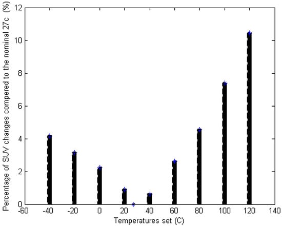 The temperature range explored starts from −40 °C and reaches up to 120 °C, in steps of 20 °C. Figure 12 compares the percentage of memory cells that change their SUVs at any temperature in the range, with the SUVs achieved with the typical corner technology and nominal temperature (27 °C).