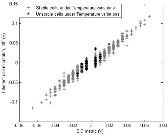 The proposed metrics attempt to clearly identify the cells that exhibit the best operating conditions for use in PUF applications. Thus, memory cells that present a high absolute SID value should show a high mismatch metric, while memory cells with balanced inverters should offer low absolute values in both metrics, denoting low repeatability of the SUV. Figure 8 presents the relationship between the proposed SID metric and the inherent mismatch represented by MF metric. Each star in the figure represents a different memory cell. The black color represents cells that have an initial SUV towards the logic state ‘0’, and the red color represents cells that have an initial SUV towards the logic state ‘1’. There is a high correlation between both metrics, which means that the further the distance of the separatrix from the ideal, the higher the mismatch the cell will present. This correlation has a linear coefficient equal to 0.965, which shows the agreement of both metrics in estimating the classification of the memory cells for PUF implementation.