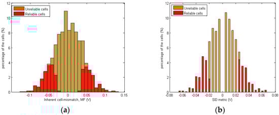Figure 14 depicts the MF and SID metrics’ histogram distributions. On both metric histograms, the reliable and unreliable cells are emphasized. Figure 14a shows the classification obtained using mismatch metric (MF), whereas Figure 14b represents the categorization of memory cells using SID metric. The proportion of reliable cells is shown by red bars, while the yellow bars show the percentage of the unreliable cells. The reliable cells have the highest absolute values using both metrics. Unreliable cells are also identified by their low metrics magnitude. These results indicate that these metrics are effective at classifying PUF cells.