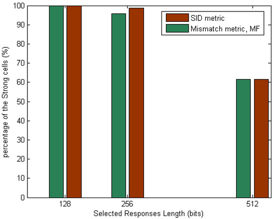 As previously stated, the reliable cells were more concentrated at the greatest metric values, and their concentration reduced as the metric value fell. Starting with the greatest metric absolute values, the PUF cells can be selected for highest reliable implementations. As the challenge-response length of PUF determines the number of SRAM cells required, if a low number of SRAM cells are required, a greater number of reliable cells will be used to construct the response, increasing the PUF dependability. Figure 15 shows the percentages of reliable cells identified by each metric methodology for various bit lengths (128, 256, and 512 bits) for constructing the SRAM-PUF response. When the response length is shortened, the proportion of detected reliable cells clearly increases.