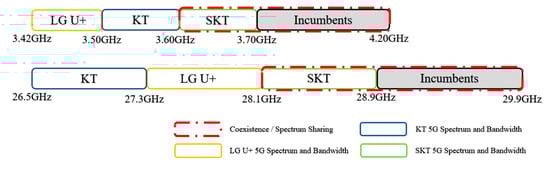 In 2018, the Republic of Korea completed auctions of the 5G frequency bands, namely the 3.42–3.70 GHz and 26.5–28.9 GHz bands, as shown in Figure 1 [1]. In the future, additional frequencies may be allocated from the adjacent frequency bands; however, there are incumbent users in the existing bands, such as fixed-satellite service (FSS) [2,3], inter-satellite services, Earth-exploration-satellite service, and meteorological-satellite service [4]. UK Ofcom has identified the 3.8–4.2 GHz band to have the potential for increased sharing and is considering the development of proposals to facilitate shared-frequency access in this band. In August 2018, the FCC of the USA adopted a Notice of Proposed Rulemaking to release the 3.7–4.2 GHz band for new wireless services, while accommodating incumbents, and to seek comments on proposals to promote more spectrum-efficient, and intensive, fixed use of the band on a shared basis. Previously, several studies have been conducted on GSM to access the current utilization of the C-band (3.5–4.2 GHz) to define a strategy and roadmap to release this band to support the deployment of 5G services. This research has been, and is being, conducted to ensure independent coexistence with other C-band users [5].