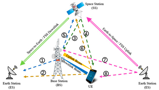 The interference between two communication systems is the main problem of the coexistence of two systems in one frequency band. There are four main types of interference between 5G and FSS systems: interference from 5G base stations (BSs) to FSS Earth stations, 5G users to FSS Earth stations (ESs), FSS devices to 5G BSs, and FSS devices to 5G users. Figure 2 shows the coexistence relationship between the FSS and cellular systems. The signal transmission paths from the space station (SS) to the ESs constitute the downlinks of the FSS system, mainly in the 3.7–4.2 GHz band, and the signal transmission paths from the ESs to a SS constitute the uplinks of the FSS system mainly in the 29.1–29.9 GHz band. In Figure 2, ➀ is the signal transmission path from a BS to an ES, and the ES interferes with the 5G system that must be protected [2,6,7]; ➁ is the signal transmission path from the user equipment (UE) to the ES, and the downlink from the SS to the ES should also be protected [2,6]. For the interference experienced by the 5G BS/UE from the SS, ③ and ④ are downlinks from the SS to the BS and UE, but it has not been varified whether ③ and ④ can coexist. The uplink from the ES to SS operates in the 29.1–29.9 GHz band, and it can coexist with the links ⑤ and ⑥ [8]; however, ⑦ and ⑧, which are the interference from the ES to BS and UE, should be protected [8,9]. In this study, we focus on minimizing ➀, the inteference from the BS to the ES. The main problem should be solved, to achieve the coexistence between the FSS and 5G cellular, under the following considerations: Furthermore, compared with ➁, the 5G gNBs utilizes massive multi-input multi-output (MIMO) systems, and the FSS ESs use antenna dishes with high directivities and antenna gains. This could lead to the alignment/misalignment of their respective antenna directions [2]. Besides, the interference signals generated and observed at the BSs are more significant than those at the UEs [3] because the equivalent isotopically radiated power of the UE is likely to be much lower than that of a BS, and the UE has a lower probability of line-of-sight (LOS) propagation towards the ES/SS [8]. In a system with the coexistence of FSS and cellular systems, we can restrain the transmission characteristics of the BSs to protect the FSS downlinks, e.g., by controlling the transmit power and/or beamforming. However, for ⑦, it is infeasible to restrain the ES.