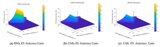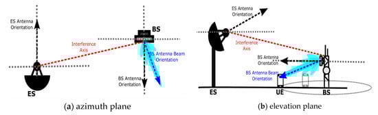 where is the transmit station signal power density in dBm/MHz [17,18], represents the antenna gain of the ES in the direction of the transmit station in dBi [11], and is the 5G BS antenna gain, with an omnidirectional antenna and massive MIMO antenna array in the direction of the ES to account for the beamforming antenna pattern in dBi [14,19], and is the combined path loss from all possible BS locations to the ES [14]. The FSS ES antenna gain is also described.