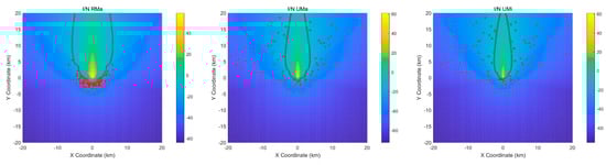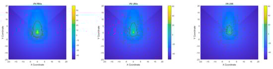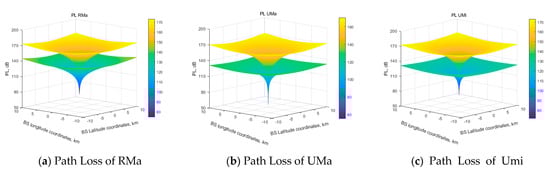 The path losses from all possible BS locations to the ES are next considered. To calculate the path loss, we adopt the 3D propagation model proposed by the 3GPP in [14], which is often referred to as the 3GPP new radio (NR) model. This model is compliant with earlier channel models, e.g., 3D SCM model [21] and IMT-advanced [22] up to 6 GHz. It also supports comparisons across the frequency bands over the range of 0.5–100 GHz and various scenarios, including RMa, UMi, and UMa. The model in [14] considers 3D propagation distance; therefore, both the BS and ES antenna heights significantly affect the actual path loss values. In cellular network simulations, the path losses in rural areas are always much lower than those in urban areas; this is, mainly, because the altitudes of the Tx and receive (Rx) antennas are the same for all scenarios. However, the ES and BS antenna heights are both different in the RMa, UMa, and UMi. The altitude differences between the ES and BS antennas are the largest in these three scenarios. The path loss for RMa is slightly higher than those of the UMa and UMi scenarios. Figure 5 shows the signal propagation losses from all possible BS locations (X, Y) at the ES (0, 0). In practice, the LOS and NLOS scenarios are combined in the real environment, and the NLOS path is often the dominant loss component in urban areas. Therefore, we combine the LOS and NLOS path losses using a random mechanism and the LOS probability as shown in Algorithm 1, which is a function of the distance, as specified in the 3GPP model.