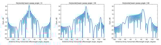 Using electronic steering, a planar URA can generate the main and side lobes. By increasing the number of elements in the antenna array, the main lobe beam can provide higher gain while creating a larger number of side lobes. The larger the number of elements in the antenna, the narrower is the main-lobe beam. However, the main-lobe beam may point in any direction, but the gain of the main-lobe beam decreases as the beam gradually deviates from the antenna array orientation. Figure 6 shows the antenna array gains of various 16 × 16 antenna arrays with different beam sweep angles.