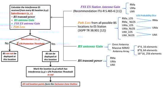 To obtain the exclusion zone in the distance protection method, the procedure shown in Figure 7 is followed. In calculating the interference from all base station locations , we need to consider: the transmission power of the base station, the antenna gain of the base station, the antenna gain of the FSS ES, and the path loss. One also needs to make sure the interference is less than the I/N protection threshold to be able to use this model. If the interference meets the protection threshold, the base station can be deployed at this location. The location is then marked in the red color. Finally, all red location points from the exclusion zone are outlined. Secondly, in determining the value of the path loss, six different methods are used, according to three different environments (RMa, UMa, UMi) and two different path loss types (LOS and NLOS). For calculating the BS antenna gain, three different antenna arrays are distinguished, including 4 × 4, 8 × 8, 16 × 16.