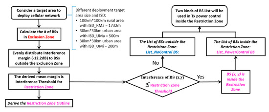 Up to this point, we have considered the distance protection method, using the exclusion zone to protect the FSS ES from interference from a single BS, where the value of I/N is less than, or equal to, the threshold. Outside the exclusion zone, the interference from a single BS is lower than the threshold; however, the aggregate interference from the other BSs exceeds the threshold. Therefore, a restriction zone is introduced to manage the aggregate interference from the cellular network to within the threshold. The derivation of the restriction zone and Tx power control list are as shown in Figure 8 and Figure 9, respectively. Based on the exclusion zone, we consider different target areas to deploy cellular networks, as shown in Figure 8. Then, we calculate the number of BSs in the restricted area, so the interference margin (−12.2 dB) can then be evenly allocated to the BS outside the restricted area to derive the restriction zone outline. Subsequently, according to the relationship between interference and the restriction zone threshold, two kinds of BS Lists are used in the Tx power control inside the restriction zone.