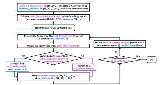 To control the Tx power of the BS, so that the total interference of all BASs is lower than the interference margin, this paper proposes the Iterative BS Tx Power Control Scheme inside the restriction zone, as shown in Figure 9. Iterative BS Tx Power Control Scheme inside the restriction zone is based on the previous method and determines whether to start Interactive Power Control Scheme by calculating the initial mean interference margin. After starting the scheme, first, we reduce the Tx power of the BS in the List_PowerControl BS by 1 dB and clear the List_NoControl BS, to achieve the effect of updating the interference of the in the List_PowerControl BS. If the interference of in the updated List_PowerControl BS is less than, or equal to, the mean interference margin, it needs to be moved to the List_NoControl BS, otherwise the Remain in List_PowerControl BS. If no BS remains in the List_PowerControl BS after relisting, the procedure ends. Otherwise, we need to update the mean interference margin, and then continue with the previous steps, knowing that there is no BS left. Compared with the restriction zone of the simple uniform BS Tx power control scheme, the advantage of the iterative power control scheme is its fairness. In this scheme, the BSs that create relatively lower interferences can be removed from the power control earlier, which results in lower Tx power reduction. Additionally, the BSs that generate relatively higher interferences remain in the power control list for an additional iteration of power reduction.