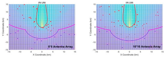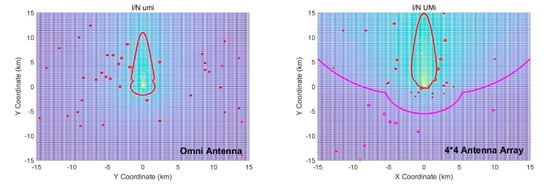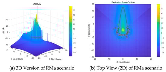 - For the UMi scenario, the array antenna has a higher gain, which results in a larger exclusion zone. Although the exclusion zone is larger than that of the omnidirectional antenna, the restriction zone at the rear of the ES antenna is much smaller. This is owed to the directional attenuation of the MIMO antenna array. Note that there are a larger number of elements in the array; therefore, the exclusion and restriction zones are larger because of the higher gain of the antenna array, as shown in Figure 30.