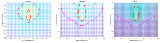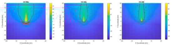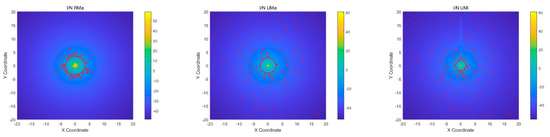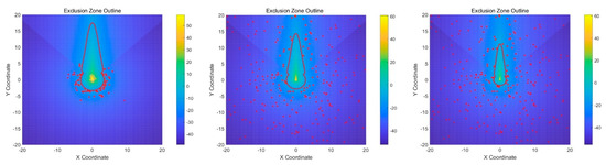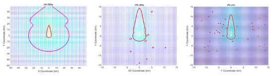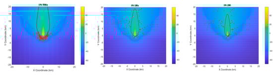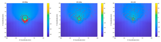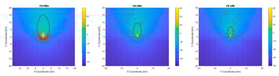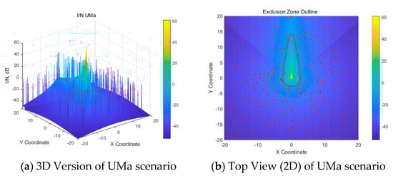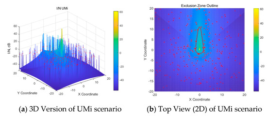 Herein, we investigate the exclusion zone with an omnidirectional BS antenna. In the RMa scenario, the x and y axes are the BS location coordinates, and the z axis is the I/N value, for which we consider the interference from a single BS. No BS can be deployed in the exclusion zone. The randomness of the LOS/NLOS path losses results in random behavior of the I/N value. For instance, the diagrams below show the case for RMa, where the BS location points at which I/N > −12.2 dB are marked in red in Figure 10. The exclusion zone, in this case, is the area within the outline. Since the main lobe of the ES antenna faces true north, a higher gain results in higher interference from the BS. Hence, the exclusion zone has a larger coverage area on the north side of the ES. Owing to the randomness of the LOS/NLOS path losses and the I/N value in the UMa scenario also demonstrates random behavior; therefore, the points with −10 dB I/N are no longer located on a perfect circle. The exclusion zone is the area where no −10 dB points (marked in red) exist, as shown in Figure 11. For the UMi scenario, the exclusion zone is smaller than that of the UMa; this is because the antenna height difference between the BS and ES is larger. The larger antenna height difference, the longer the propagation distance, which causes higher path loss. This results in lower interference and a smaller exclusion zone, as shown in Figure 12.