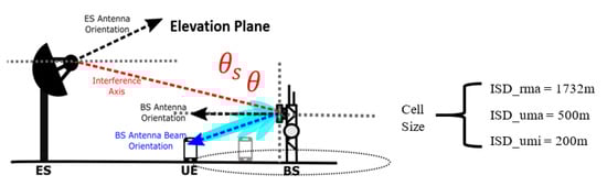 We consider three scenarios, including RMa (rural), UMa (urban), and UMi (urban) [13]. The ES antenna heights and their diameters as well as the BS antenna heights are different for these three scenarios. Further, the inter-site distances (ISDs), propagation losses, shadow fading, and LOS/NLOS probability distributions are different for the three scenarios. The carrier frequency is set to the central frequency of the 3.7–4.3 GHz band, i.e., 3.95 GHz, as shown in Figure 3. For setting the basic scenarios, we use various simulation parameters. The FSS ES simulation parameters for all the considered scenarios are presented in Table 2 and Table 3.
