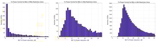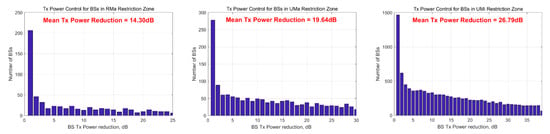Figure 22 shows the sizes of the exclusion and restriction zones. For the UMa and UMi cases, all the BSs located outside the exclusion zone require Tx power control. As illustrated in Figure 22, in the RMa, most of the BSs only need to decrease their Tx power by 1 dB; however, most of the BSs in the UMa must decrease their Tx power by 5–10 dB, and most of the BSs in the UMi must decrease their Tx power by 10–15 dB. The UMi requires the highest mean Tx power reduction because it has the smallest ISD, which indicates a larger number of BSs in the area. Figure 23 also shows the BS Tx power reduction against the number of BSs, i.e., nearly 390 BSs need to only decrease their Tx power by 1 dB in the RMa scenario.