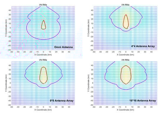 - For the RMa scenario, the array antenna has a higher gain and larger exclusion zone. Although the exclusion zone is larger than that of the omnidirectional antenna, the rear restriction zone of the ES antenna is much smaller. This is because of the directional attenuation of the MIMO antenna array. The larger the number of elements in the array, the larger the exclusion zone. This also results in a larger restriction zone, owing to the higher gain of the antenna array, as shown in Figure 26.