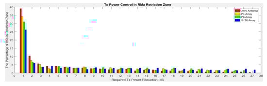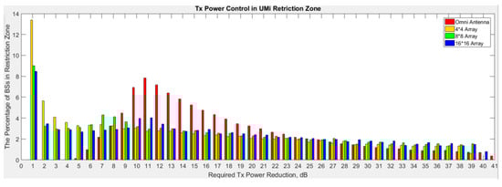 As shown in Figure 31 and Table 6, unlike the RMa, and similar to the UMa, the proposed power control scheme is more efficient when using an antenna array in UMi. However, the difference between the mean Tx power reduction is lower compared to UMa, and the mean Tx power reduction is higher than that of the omnidirectional antenna when using a 16 × 16 antenna, owing to its higher gain. From the histogram, the proportion of BSs that require power reduction over 29 dB is higher, when a 16 × 16 antenna array is used instead of an omnidirectional antenna.