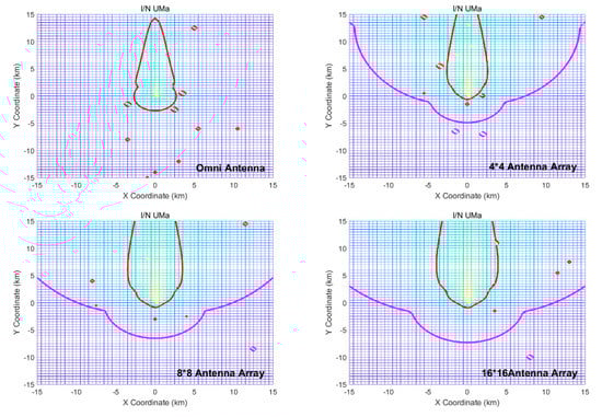 - For the UMa, the array antenna has a higher gain, thus causing a larger exclusion zone. Although the exclusion zone is larger than that of the omnidirectional antenna, the restriction zone at the backside of the ES antenna is much smaller. This is owed to the directional attenuation of the MIMO antenna array. As there are larger numbers of elements in the arrays, the exclusion and restriction zones are larger because of the higher antenna array gains, as shown in Figure 28.