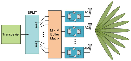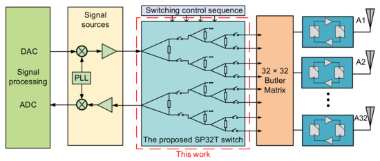 For an analog beamforming system, feeding on different input ports can form different amplitude and phase distributions among antenna elements, thus generating beams with different angles [5]. The Butler matrix is the most widely used structure in analog beamforming systems [6,7]. The structure block diagram of the single-pole multi-throw (SPMT) switch used in an analog beamforming system with a Butler matrix is shown in Figure 1. This kind of system can connect multiple antennas to one RF chain at the same time, which is very suitable for a large-scale MIMO system with a large number of antennas. It can significantly reduce the hardware cost of the system and has low computational complexity. Thus, a single-pole multi-throw switch is needed. The conventional single-pole 32-throw (SP32T) switch integrates 32 single-pole throw switches into the waveguide modules which makes the system too bulky and costly for the largely-amount applications.