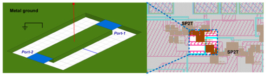 The high-frequency modeling of the pHEMT is crucial for the switch design and the advantages of the accurate modeling are important [24,25,26,27,28]. The model of pHEMT as an equivalent circuit allows the device geometrical dimensions utilized to estimate the RF performances of the switches and theoretical analysis of the switch performance. The design specifications are related to the physical parameters of the device. With the proposed modeling and several design iterations, the optimum performances can be realized finally. To accurately predict and optimize the performance of the switch, the modeling of the GaAs has been developed in Figure 2. Compared to the transistors working in the amplifying state, the transistors work in the ON and OFF state for the switch. When the transistor works in the ON state, the transistor model is resistance and inductance in series, and the inductance is generated by the VIA, while the model in the process library does not consider the inductance of VIA. The of the transistor used in the proposed switch is 11–13 fF when the transistors work in the OFF state and the of the transistor used in the proposed switch is approximately 14.9 Ω when the transistors work in the ON state, and the cut-off frequency is 154 GHz. The control voltage for the gate is well above or below the threshold voltage.