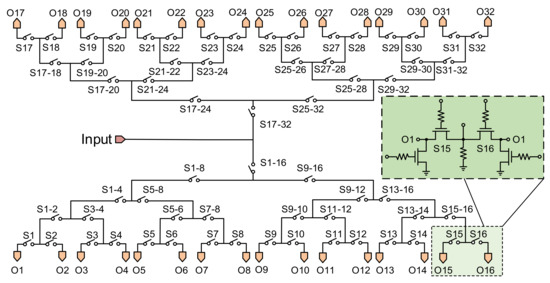 The proposed tree structure for the SP32T with high isolation between different channels.