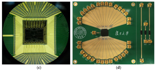The proposed SP32T switch was fabricated in a GaAs process for a sub-6 GHz communications system. It achieves a working frequency of up to 6 GHz. Figure 9 shows that the whole chip area including all testing pads is 12 mm2 and also shows the printed circuit board (PCB).
