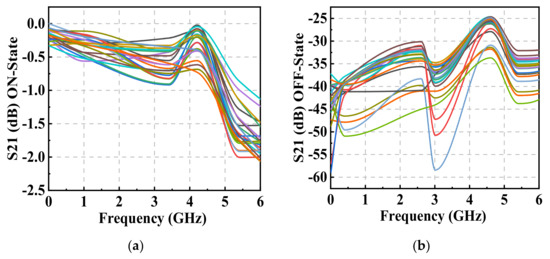 Equation (11) contains the resistance of the ON-state switch and the capacitor of the OFF-state switch. The electric length of the transmission line also affects its insert loss. By optimizing these parameters, insertion loss can be minimized.