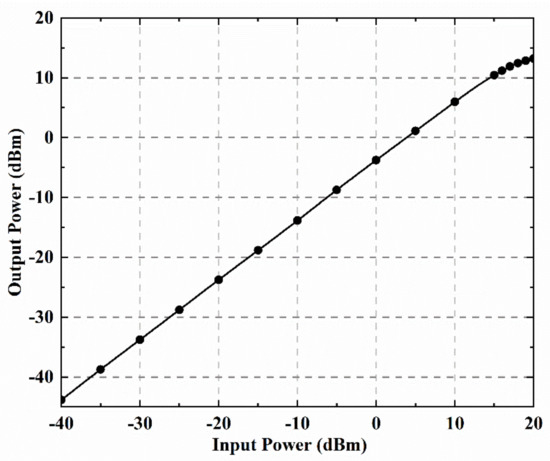 The linearity of the switch is characterized by the input power compressed by 1 dB (P1dB). Different input powers were utilized to measure the P1dB, which is approximately 15 dBm, as shown in Figure 13. The input of the single-chip switch is connected to the signal generator (E8257D Keysight) with a frequency of up to 67 GHz and its output is connected to the signal analyzer (N9040B Keysight) with a measurement frequency of up to 50 GHz.