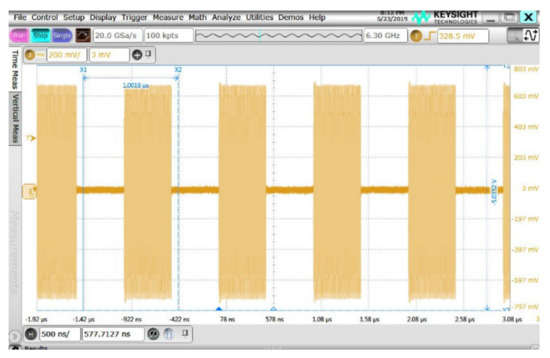 Time domain measurement results for the ON and OFF state of the switch for one channel. The speed of the ON/OFF is 10 MHz and the carrier frequency is 1 GHz.