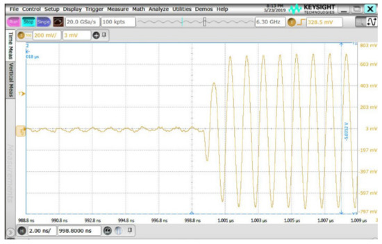 To assess the operating speed of the switch, different input frequencies and switching control signals are performed. Agilent 33250A function/arbitrary waveform generator was used to generate the control signals. Additionally, Keysight E8257D signal generator was used to generate the different input frequencies. The transient measurement switching speed of the proposed SP32T is shown in Figure 14, Figure 15 and Figure 16, when inputting the 10 MHz gate control signal waveform. The period of ON/OFF time for the switch is 50 ns. The transient time transferring from the turn-ON to turn-OFF is very fast at 1 ns, including a coaxial cable propagation delay of 0.5 ns. The measurement results show the proposed switch has ultra-fast speed and is feasible for the sub-6 GHz communications system. Additionally, the spectrum measurements are also utilized to check the isolation when the switch is turn-ON and turn-OFF, as shown in Figure 17. Compared with the switches in Table 1, the proposed chip can achieve low loss with 32 outputs. In the future, the chip area of the proposed switch can be reduced by optimizing the channel layout and transmission line structure.