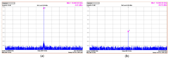 (a) The spectrum measurement for ON state with 10 KHz BW and 50 MHz frequency span range; (b) the spectrum measurement for OFF state with 10 KHz BW and 50 MHz frequency span range.