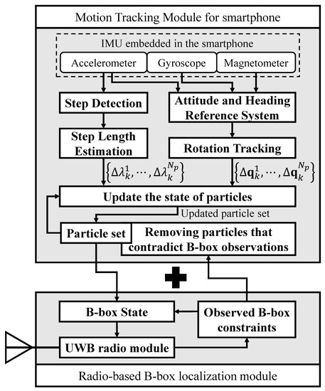 The proposed localization module using UWB radio is based on the Bounding-box (B-box) algorithm [23]. The B-box state represents the rectangular region where each node is located, and the B-box localization module informs the neighboring nodes of its B-box state. For smartphones with UWB transceivers and inertial sensors, a motion tracking module was added. Pedestrian movement was tracked through particle filtering, and the updated state of the particle set was converted to a B-box state.