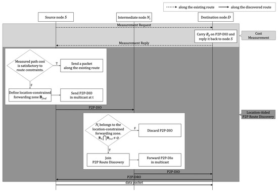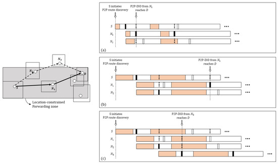 However, as shown in Figure 5c, if all nodes in the network participate in P2P route discovery in P2P-RPL, node S can reach node D through an alternate relay node . Even though the path length of this route (i.e., S − − − D) is longer than the shortest route (i.e., S − − D), the minimum interval length () is much longer than the transmission delay, and thus node S reaches node D faster.