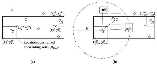 As shown in Figure 3a, node S defines the location-constrained forwarding zone for P2P route discovery as the rectangular region that includes the current estimated location states of the node S and node D. The four corners of the forwarding zone are computed as follows: