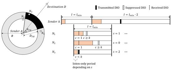 As shown in Figure 5b,c, when the standard trickle timer was used and the length of the listen-only period of two nodes were the same, the probabilities of the P2P-DIO sent in the current interval of and were the same. If sends a P2P-DIO, a node keeps silent in the current interval as the redundancy message counter c is greater than the redundancy constant k. As node S can reach node D only through inside the location-constrained forwarding zone, the latency to reach node D increases as much as the interval length keeps silent.