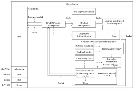 The software architecture of Collision Avoidance Geographic P2P-RPL is illustrated in Figure 6. The arrow in Figure 6 depicts the P2P-DIO packet flow.