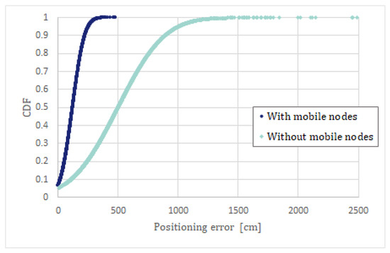 Five mobile nodes were moving continuously with slow random walking speed and operated as leaf nodes without intermediate route forwarding features in the route discovery procedures [43,44]. The four outermost static nodes were anchor nodes with prior known positions. In this simulation study, we defined the concept of the average node degree for the performance evaluation in terms of the node density. The average node degree was defined as the average number of one-hop neighbors of a node in the network. The higher the average node degree was, the higher the node density was. The average node degree varies from 6, 9, to 12.