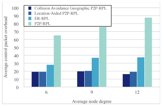 Figure 8 shows that Collision Avoidance Geographic P2P-RPL achieved about 75.7%, 45.9%, and 6.5% less control packet overhead on average compared with P2P-RPL, ER-RPL, and Location-Aided P2P-RPL, respectively. In Collision Avoidance Geographic P2P-RPL and Location-Aided P2P-RPL, only the node inside the location-constrained forwarding zone re-broadcasts a DIO control packet. Collision Avoidance Geographic P2P-RPL and Location-Aided P2P-RPL exploit accurate location information obtained from self-localization to reduce the search space for route discovery. The search space for route discovery is limited to the location-constrained forwarding zone based on the location information of the source node and the destination node.