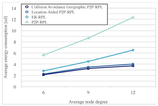 Figure 9 shows that Collision Avoidance Geographic P2P-RPL achieved around 34.3% less energy consumption in comparison with ER-RPL and was reduced by more than twice compared to P2P-RPL on average. The energy model only considers the transmitting and receiving states; hence, the number of control packets constitutes a significant portion of the energy consumption.