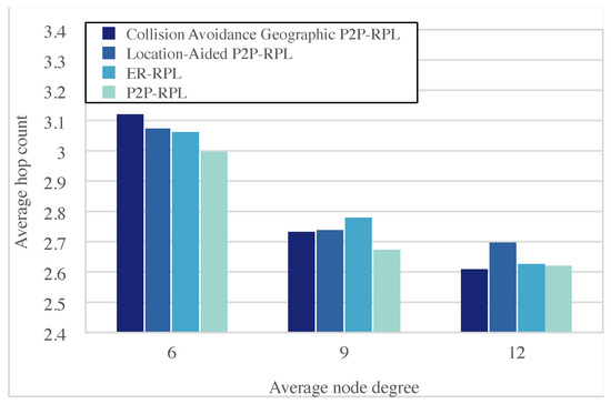 Figure 10 shows that the average hop count of P2P routes discovered by the Collision Avoidance Geographic P2P-RPL was very close to P2P-RPL when the average node degree was nine or more. P2P-RPL achieved the smallest hop count by discovering the P2P path through the whole network. Collision Avoidance Geographic P2P-RPL and Location-Aided P2P-RPL could not find a shorter route than P2P-RPL because these algorithms only search the location-constrained forwarding zone based on the location information of source and destination nodes. In this simulation network configuration, the network was fully connected. When the average node degree was 6, all algorithms discovered longer routes than when the average node degree was 9 or more. As the average node degree increased, shorter routes were discovered.