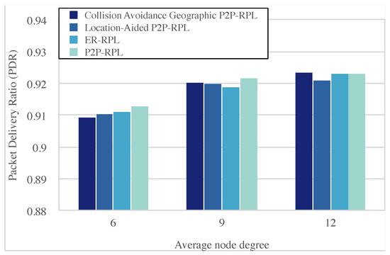 The PDR performance under various average node degree is shown in Figure 11. As the average node degree increases, PDR increases. The PDR of Collision Avoidance Geographic P2P-RPL is observed about 90.9% at the average node degree of 6, 92.0% at the average node degree of 9, and 92.3% at the average node degree of 12. Although partial nodes participate in route discovery procedure, ER-RPL, Location-Aided P2P-RPL and Collision Avoidance Geographic P2P-RPL still achieve close performance to P2P-RPL when the average node degree is 9 and 12.