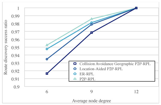 Figure 12 shows the route discovery success ratio in the first route discovery attempt. As the average node degree increased, all algorithms could have a higher probability of finding the P2P route from the source node to destination node. Since P2P-RPL searches the P2P path throughout the entire network, ER-RPL, Location-Aided P2P-RPL, and Collision Avoidance Geographic P2P-RPL with limited search space for route discovery cannot improve the route discovery success ratio better than P2P-RPL.