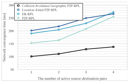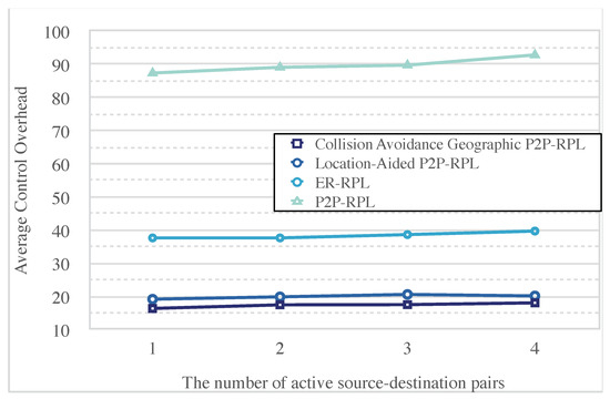 Figure 14 shows that, as the number of active source-destination pairs increased, the number of control packet overhead increased. As the number of active source-destination pairs increased, the link losses caused by packet collisions increased. If the node on the shortest path from the source node to the destination node failed to send the DIO control packet to the intermediate nodes, the node retransmitted the DIO control packet in the next interval, thus, resulting in increased control packet overhead. Collision Avoidance Geographic P2P-RPL achieved average 13.0%, 54.8%, and 80.7% less control packet overhead compared with Location-Aided P2P-RPL, ER-RPL, and P2P-RPL, respectively.