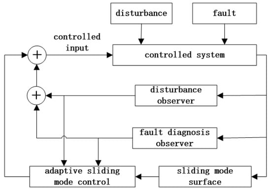 Motived by the above analysis, a novel composite observer including FDO and DO is designed to dynamically reject unknown faults and mismatched disturbances. To make up for the mismatched disturbances, a sliding surface and a sliding mode controller are established, which not only compensate the faults and disturbances simultaneously but also guarantee the ultimately uniformly bounded (UUB) performance of a controlled system. A flow chart is shown in Figure 1. It can be seen that the proposed algorithm can realize the unmatched dynamical compensation, which improves matched results and the traditional robust problem. In addition, compared with some single anti-disturbance or fault-tolerance algorithms [46,47], the result also represents a quite significant extension. Finally, as for a typical unmanned aerial vehicle (UAV) system, a simulation example is given to certify the validity of the algorithm.
