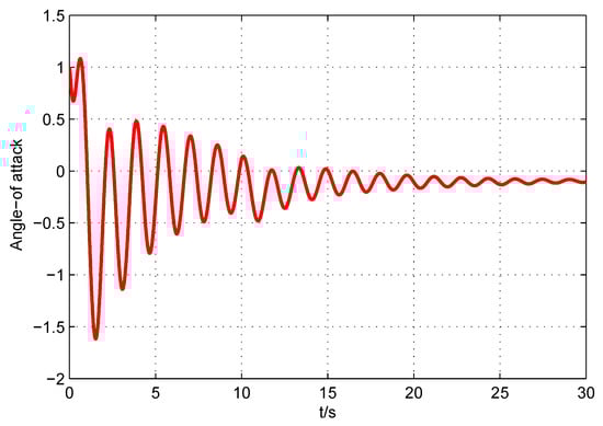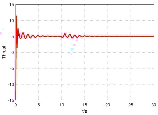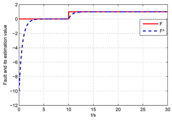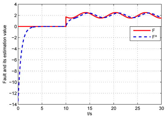 The initial values of states are . A favorable fault identification effect is displayed in Figure 7. Meanwhile, from Figure 8, we can find that the mismatched disturbance can be effectively estimated. In addition, the process of system states is shown in Figure 9, which shows that the system states can eventually reach the sliding surface. Figure 10 and Figure 11 show the trajectories of thrust and the elevator deflection angle of the UAV system. The states of the UAV model are designed as in Figure 12, Figure 13, Figure 14 and Figure 15, respectively, which reflect the satisfactory stability performance. It can be seen from the simulation results that the designed anti-disturbance fault-tolerant sliding mode control algorithm is effective.