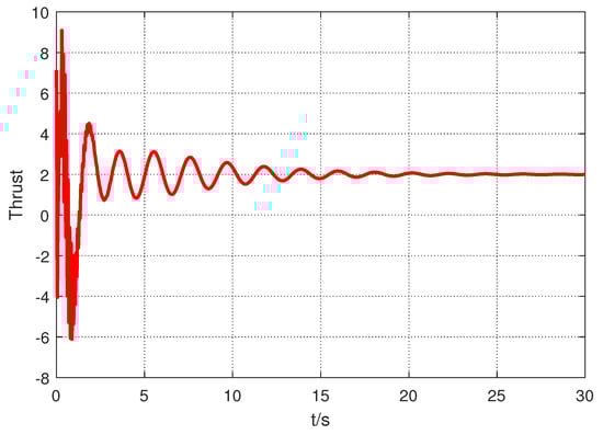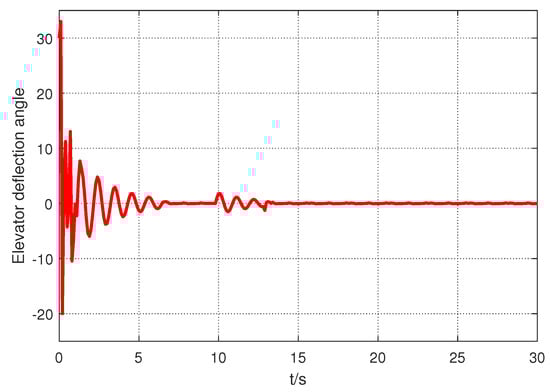 The initial values of states are assumed as . Figure 2 and Figure 3, respectively, display the dynamic trajectories of constant fault and attenuated harmonic disturbance, as well as their accurate estimates. It can be concluded that the designed FO and DO show effective estimation performances. The dynamic trajectory of the sliding surface is shown in Figure 4, and it can be proved that the sliding surface is reachable. Figure 5 and Figure 6, respectively, show the thrust and the elevator deflection angle of a UAV system that vary with time, which also imply that the UAV system is eventually stable.