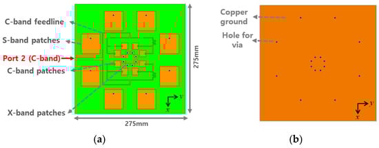 A multi-band array antenna has garnered a lot of attention for modern radar applications which create diverse beam configurations and operate at different frequencies with one radar platform [1,2,3]. A shared aperture antenna has widely been used to realize different groups of array antennas in a limited space [4,5,6,7,8,9,10,11]. A shared aperture antenna with tri-band and dual polarization has been studied using diverse patch, dipole and monopole elements based on a multi-layered feed network [4]. Dual-band arrays with versatile polarization generation have been developed for satellite communication and radar applications [5,6]. Efforts have been made to design an optimized element antenna in order to achieve the multi-band characteristics of an array antenna. A multi-layered element design has been used to realize a compact linear uniform array for base-station applications [7]. A dual-band and dual polarized array antenna based on parasitic patch elements has been implemented on multi-layered substrates [8]. In addition, there have been several research activities on the layout of the multi-band array antenna. The best placement of antenna elements for different frequencies has been investigated based on the Genetic algorithm [9]. Array configurations based on element antennas operating at different narrow bands have been studied to realize a wide frequency bandwidth [10]. Diverse optimization algorithms have been applied to design the multi-band patch antenna [12] and to enhance the directivity of the Fabry–Perrot cavity antenna [13]. More sophisticated optimization algorithms based on a neural network [14] and an ant colony optimization [15] has recently been studied. However, although there have been a lot of studies on the design of the shared aperture antenna, it is still challenging to reduce the mass and size of the antenna. The use of the floating antenna may be disadvantageous in terms of providing a low profile and stubborn structure [6]. The multi-layered radiating elements are restricted to achieve the desired radiation characteristics for all radiating elements [5]. The utilization of the multi-layered design involves the complication of the fabrication process with increasing the mass of the entire structure [4,5,8]. In addition, it is difficult to achieve the best layout of the array antenna while it satisfies the optimum spacing at its operating frequency.