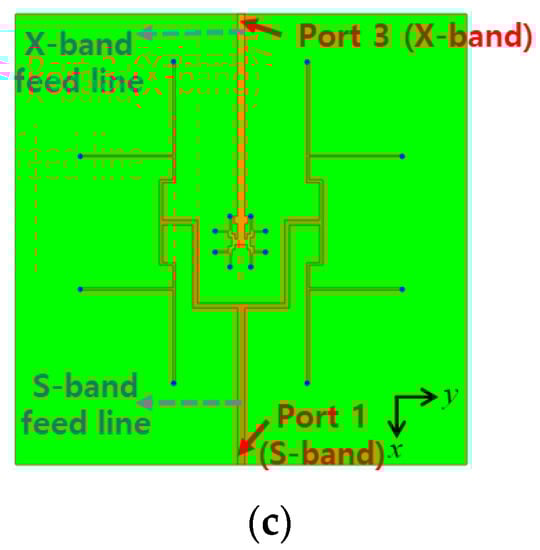The configuration of the proposed antenna is shown in Figure 1a–c. Two substrates with εr = 2.2 (Taconic TLY-5) were used in order to implement the triple-band array antenna and its feed network. The size of the proposed array antenna was 275 mm × 275 mm. The thickness of the two substrates was selected as 3.2 mm, which is advantageous to create a low-profile antenna. The ground plane between the two substrates is commonly used for the array antenna and the feed network. The proposed antenna is made up of the three sets of radial array antennas which operate at different frequencies. Each outer, middle, and inner radial array operates at an S-band, C-band, and X-band, respectively. The radius of the radial configuration is set as 1.05 λ. Each array antenna consists of eight elements of microstrip patch antennas. The inter-element spacing is set as 0.8 λ, which is the minimum distance preventing collapse of the elements. The minimum inter-element spacing is helpful in terms of reducing the appearance of grating lobes. The length of the patch element was approximately set as 0.5 λ, and the polarization direction of the electric field was parallel to the x-axis for S- and X-band radial array antennas, while it was parallel to the y-axis for C-band radial array antenna. For port 1 and the port 3, coaxial probe feeds were used to deliver power to C- and X-band array antennas. The substrate and ground plane were perforated to construct 16 vias which were used to feed the array antennas, and the diameter of the vias was set as 1 mm. For port 2, a microstrip feedline was used for the C-band array antenna. A T-shaped power divider was used to divide the magnitude of the input signal. The length of the feed line to an element antenna was identical to provide the signal in phases to the all-element antennas. The width of the feed line gradually decreased as the length of the feed line to an element antenna was reduced, in order to minimize the reflection due to the power divider.