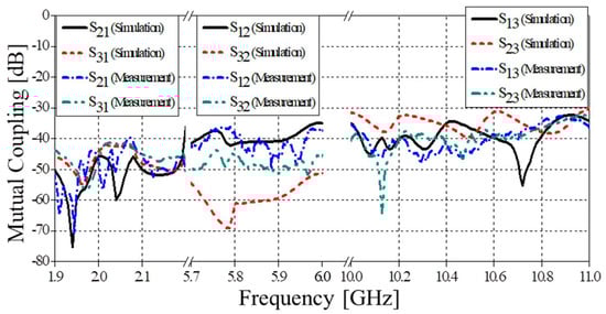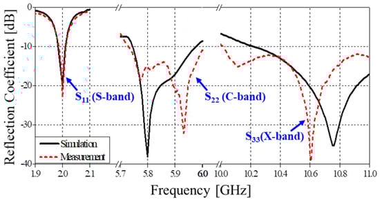 For the purpose of the evaluation, the proposed antenna design was evaluated using a full-wave simulation tool, HFSS. The simulated result was compared with the measured results. A photograph of the proposed array antenna is shown in Figure 2. Two substrates of Taconic TLY-5 were used for the fabricated antenna design. Two substrates were firmly attached using plastic screws. A comparison between simulated and measured reflection coefficients is shown in Figure 3. The three types of the radial array antennas provided impedance matching of less than −20 dB at the different frequency bands, which were reasonably good matching characteristics. It was observed that the resonant frequency of the measurement deviated from that of the simulation by 2.2% (C-band) and 1.4% (X-band), whereas an excellent agreement between the simulation and the measurement was observed for the S-band array antenna. The shift of the resonant frequencies (C-band) might be attributed to the connector effect, which is not included in the simulated results, although it affects the measured results. It is worth of noting that the reflection coefficient of one port was measured while the other two ports were terminated. Simulated and measured mutual couplings between two ports are presented in Figure 4. Excellent isolation below −40 dB was obtained throughout the frequency bands of interest. This might be attributed to the orthogonal antenna polarizations of two neighboring array antennas, as previously reported in [17]. The radiation patterns at the frequencies of 2 GHz, 5.8 GHz, and 10.525 GHz were measured inside a far-field anechoic chamber. The simulated and measured radiation patterns (co-pol) are shown in Figure 5. The far-field range of the anechoic chamber was enough to measure the proposed antenna at the far-field distance of the array antenna. The proposed antenna provides a simulated maximum gain of 14.7 dB, 15.7 dB, and 12.9 dB at each operating frequency band. The reasonably stable maximum gain was obtained owing to the identical number of element antennas that each array antenna possessed. The measured maximum gains were 14.3 dB, 15.3 dB, and 12.5 dB at each operating frequency band, which deviated from the simulation by less than 0.4 dB. It was observed that the cross-polarization level obtained from the full-wave simulation was below −41 dB in the S-band, below −23 dB in the C-band, and below −16 dB in the X-band in terms of each co-polarization level. The deviation between simulated and measured results was mainly caused by manufacturing tolerances, RF connectors, and manufacturing error of the 16 vias.