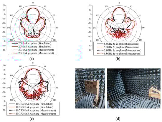 Comparison of the simulated and the measured radiation patterns at the frequency of (a) 2 GHz, (b) 5.8 GHz, (c) 10.525 GHz, and (d) photograph of the measurement setup inside the far-field anechoic chamber.