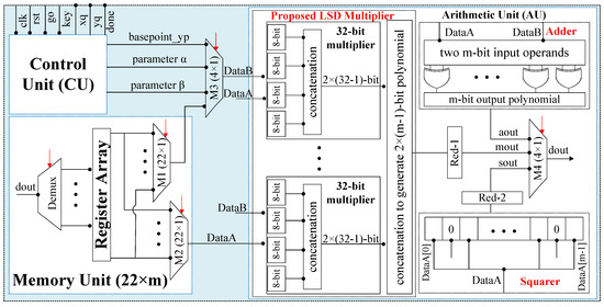 The proposed hardware architecture (AREEBA) for BHC model of ECC is illustrated in Figure 1. For testing and verification, the initial BHC curve parameters for the proposed design are selected from National Institute of Standards and Technology (NIST) [27]. The PA and PD formulas from Table 2 are employed to compute PM operation over and . As shown in Figure 1, the proposed architecture consists of a memory unit (MU), Arithmetic Unit (AU) and a dedicated control unit (CU). The additional multiplexers (i.e., M3 and M4) are used for the routing purpose, either from MU to AU (or) AU to MU.