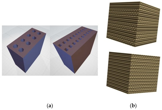 The construction of the panel was preceded by an important industrial research phase, both to verify that there was not a similar panel capable of performing the functions of MULTIFId and to understand the characteristics to be achieved. Particular attention was paid to the optimization of the shape and the vacuum percentage of the section, in order to achieve resistance and thermal conductivity parameters similar to those of commercial products. For the panel type (a), square, rectangular, and hexagonal mesh sections have been designed. For panel type (b), sections were created with parallel layers, orthogonal by 1 × 1 and 2 × 2 (Figure 1).